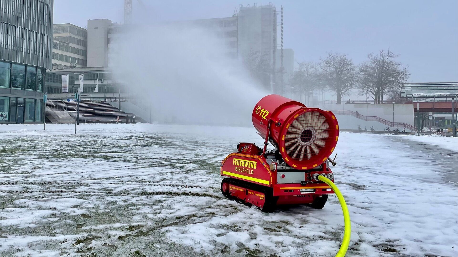 Die Bielefelder Feuerwehr hat jetzt einen speziellen Löschroboter bekommen. Das gut zwei Tonnen schwere ferngesteuerte Kettenfahrzeug kann im ganzen Stadtgebiet eingesetzt werden, soll aber speziell auch den Brandschutz während des Uni-Umbaus erhöhen. Deshalb teilen sich die Stadt und der BLB als Eigentümer des Unigebäudes auch die Kosten von rund 640.000 Euro.