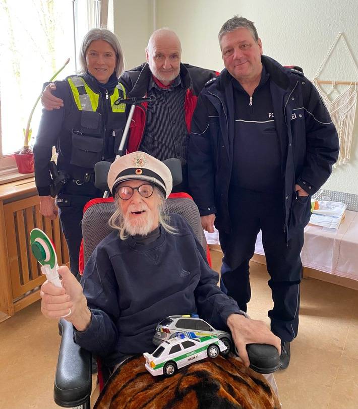 Dieter ist mittlerweile bettlägerig und kann sich nur noch sehr eingeschränkt äußern. Doch auch wenn seine körperlichen und geistigen Kräfte nachlassen, ist seine Begeisterung für die Polizei geblieben. Davon konnten sich die Leiterin der Polizeiwache Süd, Erste Polizeihauptkommissarin Christine Schmitt, und der Bezirksdienstbeamte für Bethel, Polizeihauptkommissar Dirk Hackländer, bei ihrem Besuch überzeugen.