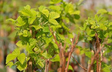 Das hellgrüne Laub der Himbeeren bietet einen schönen Kontrast zu den glänzenden braunen Trieben. Foto: Jutta Langheineken